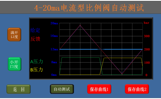 6、比例閥正常時(shí)的表現(xiàn)為:a、給定電流12.00ma時(shí),反饋電流在12.00ma,比例閥輸出的A、B腔壓力相同;b、用滑動(dòng)條可迅速換向,反饋電流改變且A、B腔壓力差較大;c、點(diǎn)擊增加按鈕,反饋電流逐漸增加且A、B腔壓力差逐漸增大;d、點(diǎn)擊減少按鈕,反饋電流逐漸減少且A、B腔壓力差逐漸減少,過(guò)12.00ma后比例閥會(huì)換向;