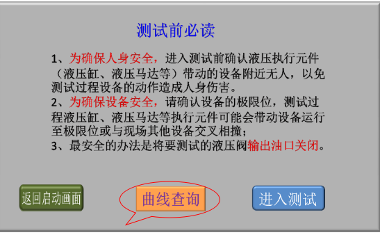 3、確認(rèn)現(xiàn)場(chǎng)人員和設(shè)備安全后,點(diǎn)擊“進(jìn)入測(cè)試”,進(jìn)入液壓閥測(cè)試類型選擇畫(huà)面;